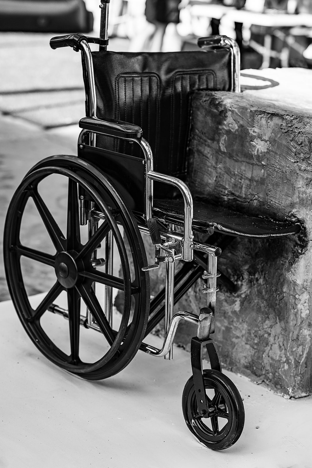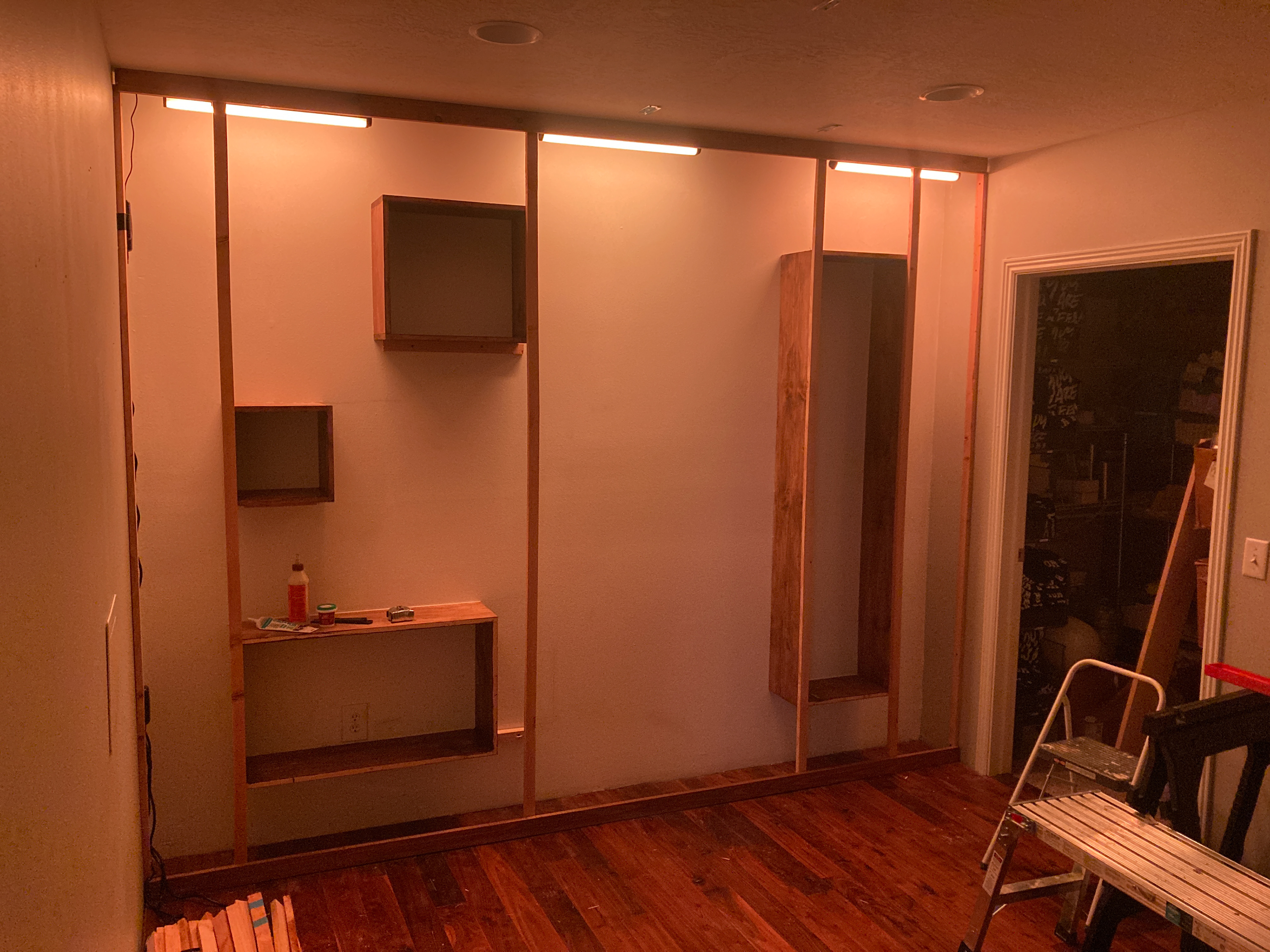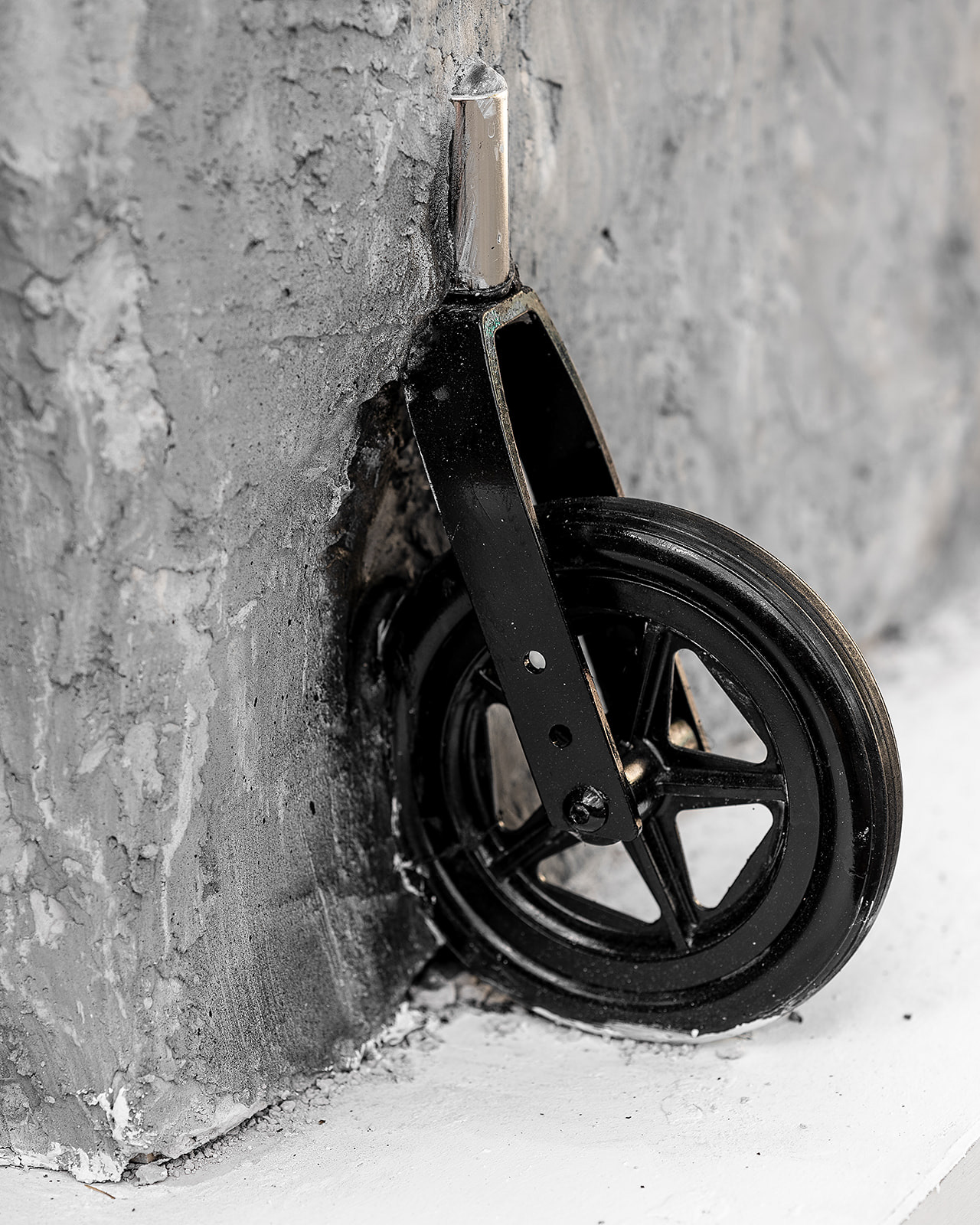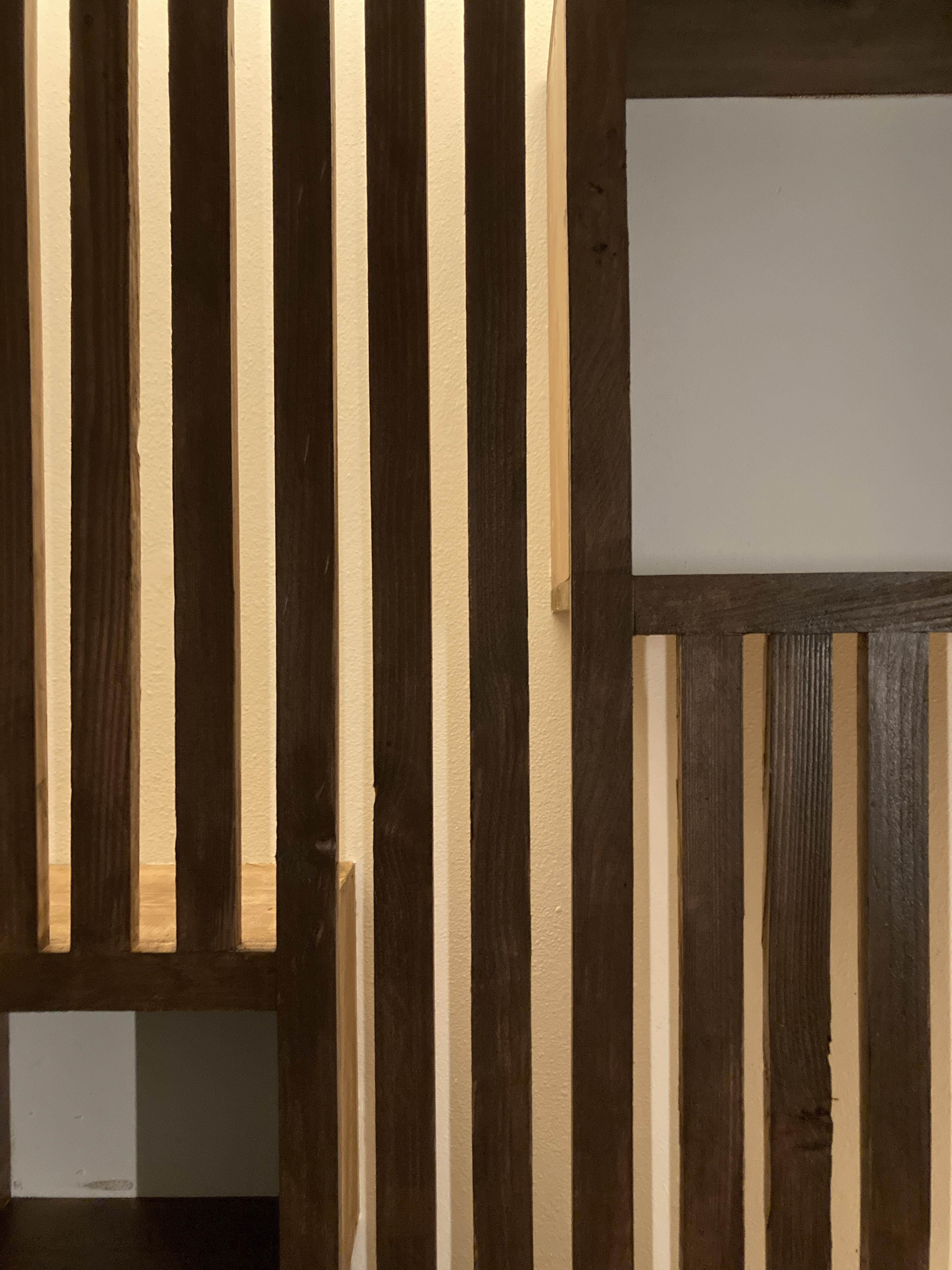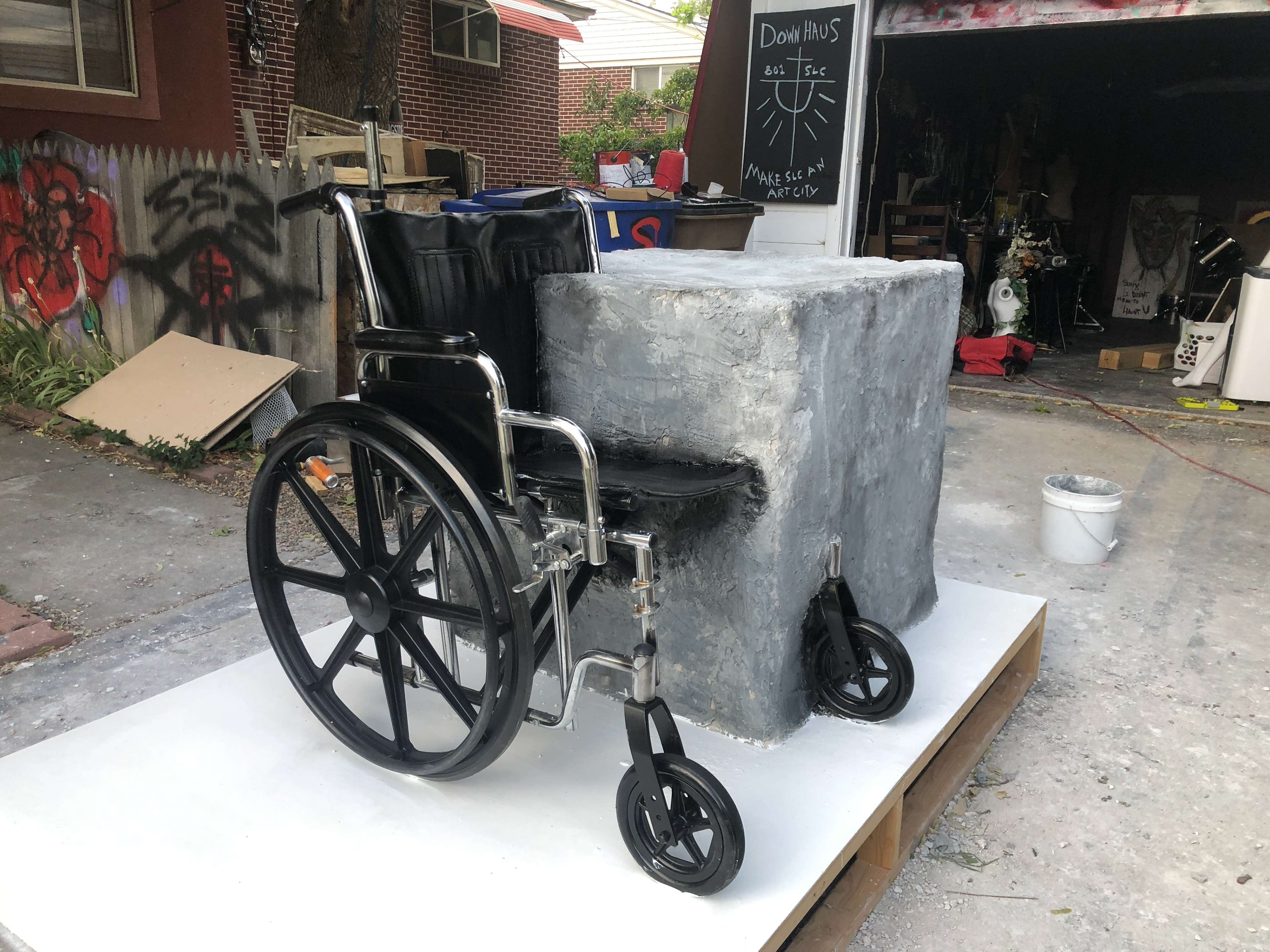 Repurposed mannequin parts, foam, plaster of paris, acrylic paint, wood, LED tubing, plexiglass