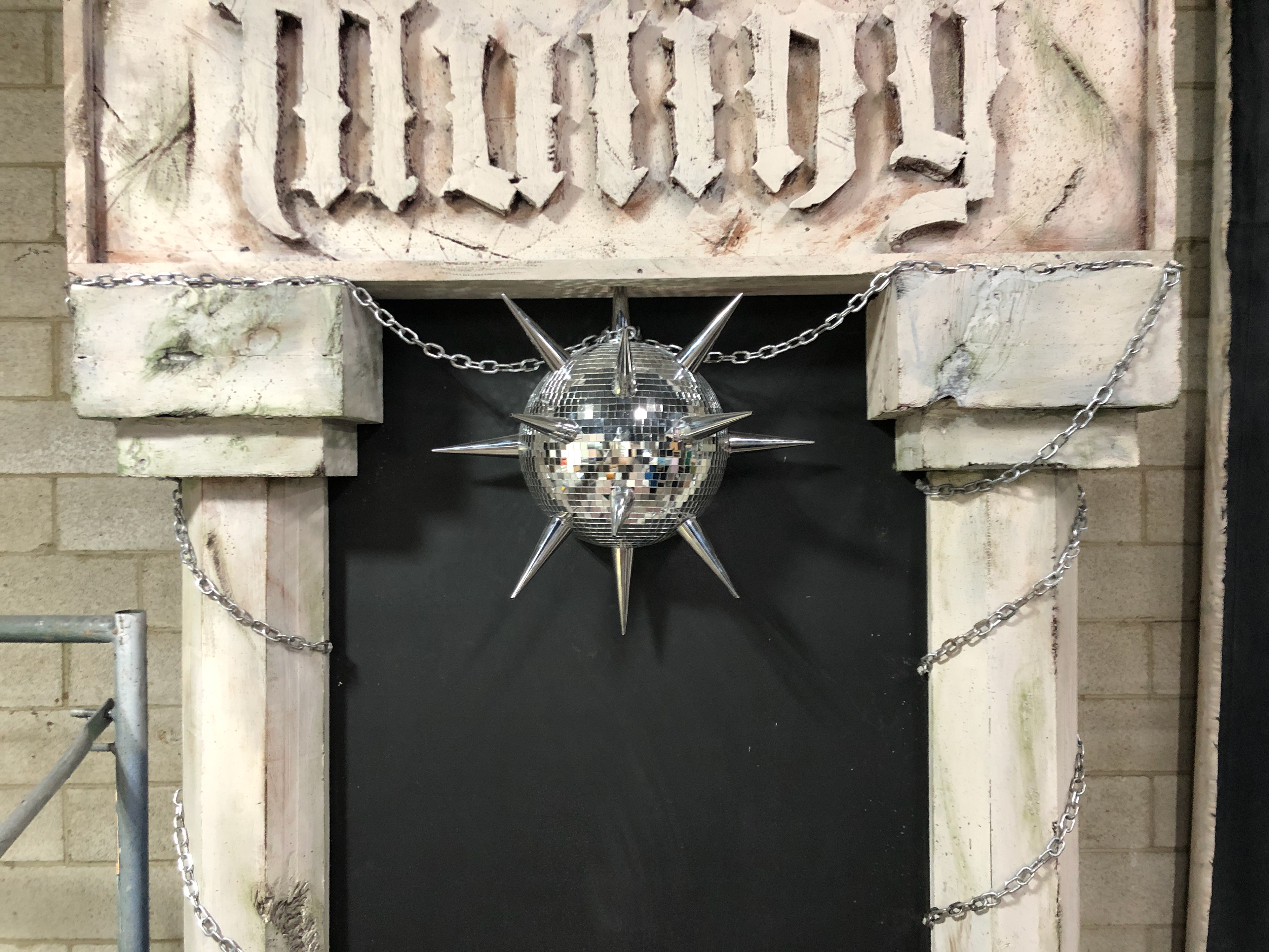 Hand constructed & tiled 5ft Disco Ball with Spikes, Foam "Mutiny" greek pillar photo backdrop, "Mutiny" logo mural